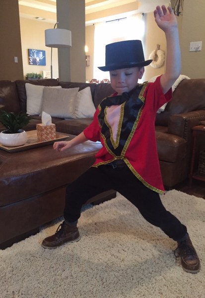 When we took him to see The Greatest Showman last week, it was impossible to say no when he leaned over in the middle of the movie and asked if he could get a top hat. Before we even made it home from the theater, Amazon was set to deliver his new hat just 48 hours later. And of course, it had to be accompanied by a ringmaster jacket…so we pulled that together the next day too.
